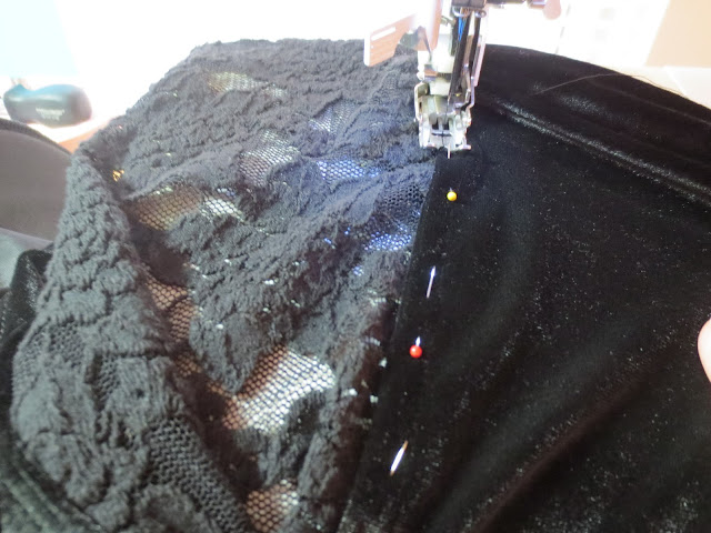 Here is the right side. I reversed the pin and pinned it on the right side as shown. I want to top stitch the velvet to the lace.